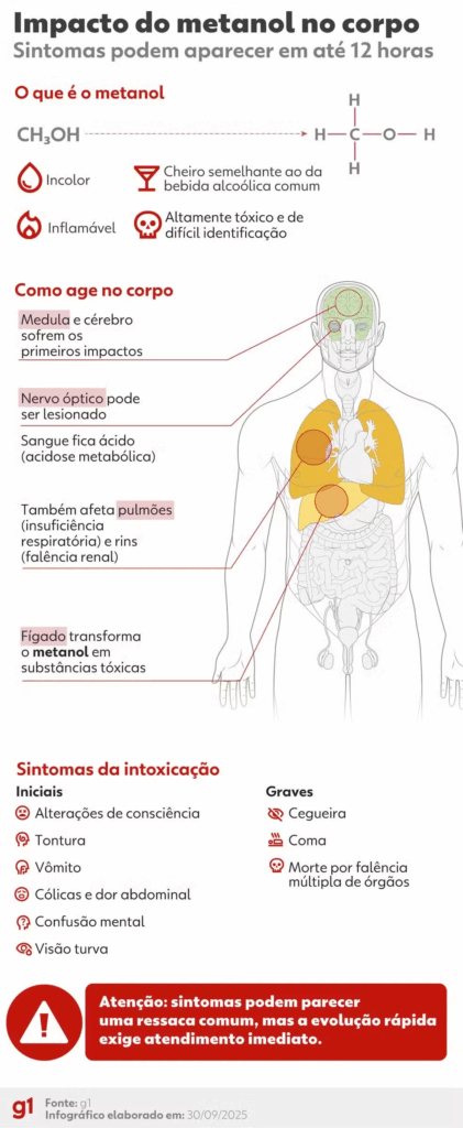 🔍 O metanol é um álcool usado industrialmente em solventes e outros produtos químicos, é altamente perigoso quando ingerido. Inicialmente, ataca o fígado, que o transforma em substâncias tóxicas que comprometem a medula, o cérebro e o nervo óptico, podendo causar cegueira, coma e até morte. Também pode provocar insuficiência pulmonar e renal.