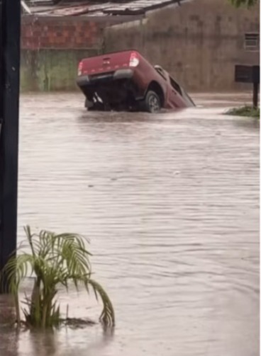 Fortes chuvas atingem cidade da BA; picape fica parcialmente submersa e ocupantes deixam veículo pela janela