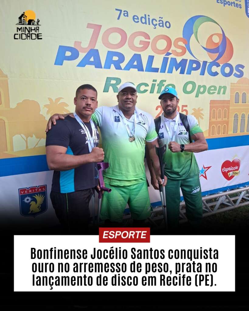 O atleta Jocélio Santos brilhou no Recife Open Paralímpico, conquistando o título de campeão no arremesso de peso e o segundo lugar no lançamento de disco. A competição reuniu equipes de todo o Norte e Nordeste, e mais uma vez Jocélio demostrou ser um dos grandes nomes do paradesporto nacional. Agora, o bonfinense já se prepara para a final do Campeonato Brasileiro, que será realizada em dezembro, na cidade de São Paulo.