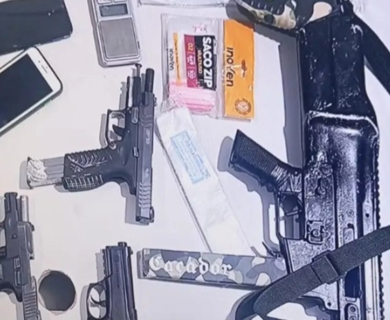 Foram apreendidos dois fuzis, sendo um deles equipado com uma luneta para disparos a longa distância, uma espingarda calibre 12, uma submetralhadora, uma pistola, um revólver, além de drogas, munições e um drone.